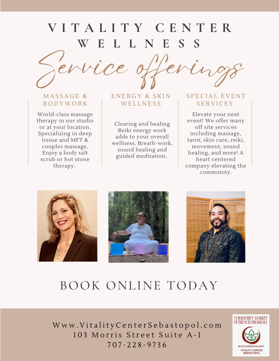 Vitality Center is proud to collaborate with Community Market and many other community businesses and organizations including, the Wellness Days Community Outreach Program in Sebastopol making wellness education and practice accessible to all!